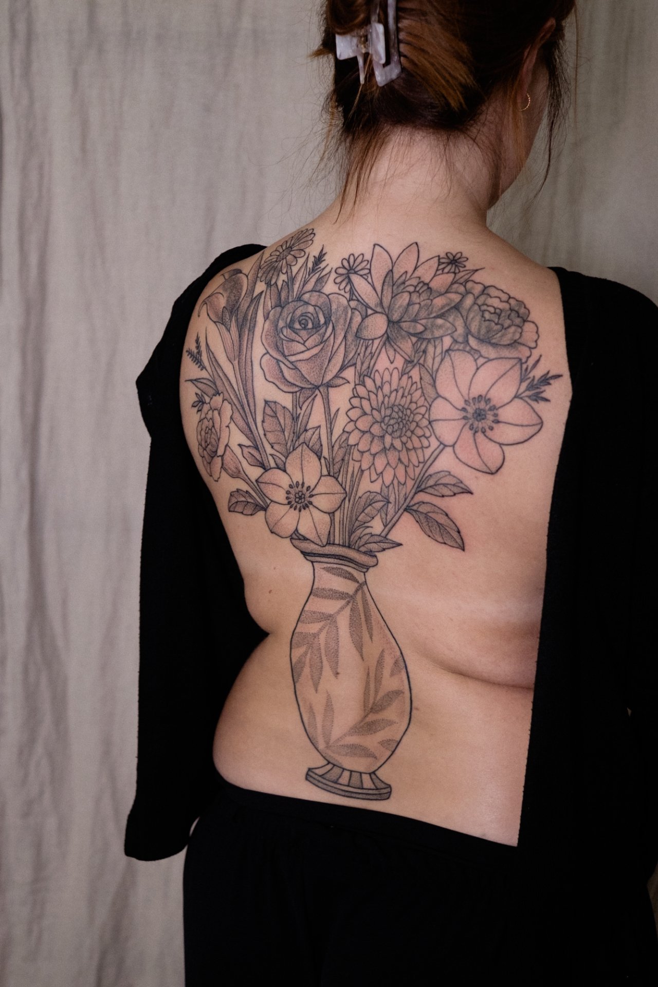 Großflächige Blumen wie Pfingstrosen, Chrysanthemen, Blätter, dunkle Vögel, Vasen oder schwarze Elemente wie Punkte, Flächen in Blackwork oder Mandalas mit dunklen Elementen eignen sich hervorragend für ein Cover-up.
